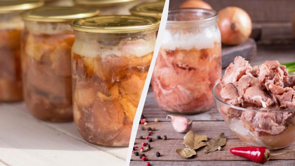 Was het vlees, snijd het in middelgrote stukken en zout het. Verdeel twee of drie erwten peper en een laurierblad in schone potten. Leg het vlees vervolgens strak in de potten.