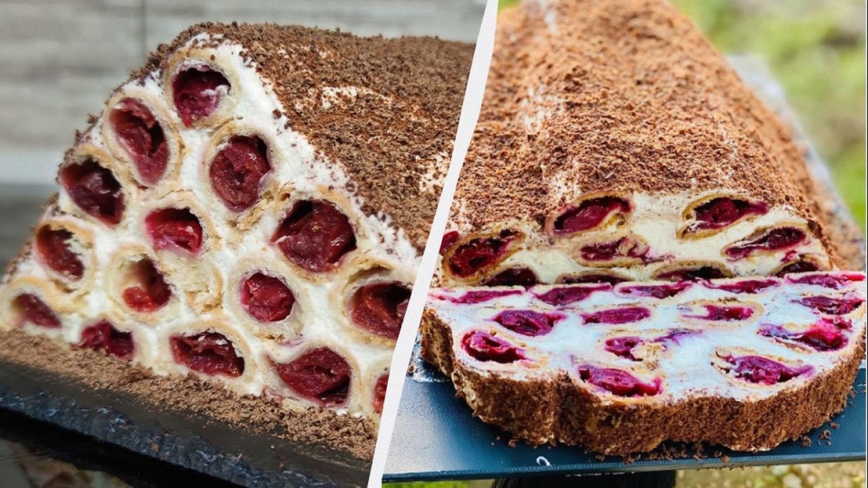 De heerlijke Kloosterhutcake is een van de meest “winterse” desserts. Het is niet alleen heerlijk, maar ook een prachtig dessert dat lijkt op met sneeuw bedekt brandhout. Het idee van het gerecht is heel eenvoudig – deegbuizen zijn gevuld met kersen, op elkaar gestapeld in de vorm van een piramide en besmeerd met zure room. Het afgewerkte dessert is zoetzuur, met een bessentoets, en erg licht voor de maag.