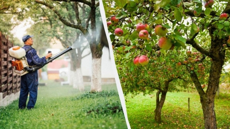Maak een oplossing waarmee je voorkomt dat bladluizen binnen een meter van je appelbomen komen.Bladluisbehandeling op appelbomen / collage My, foto...